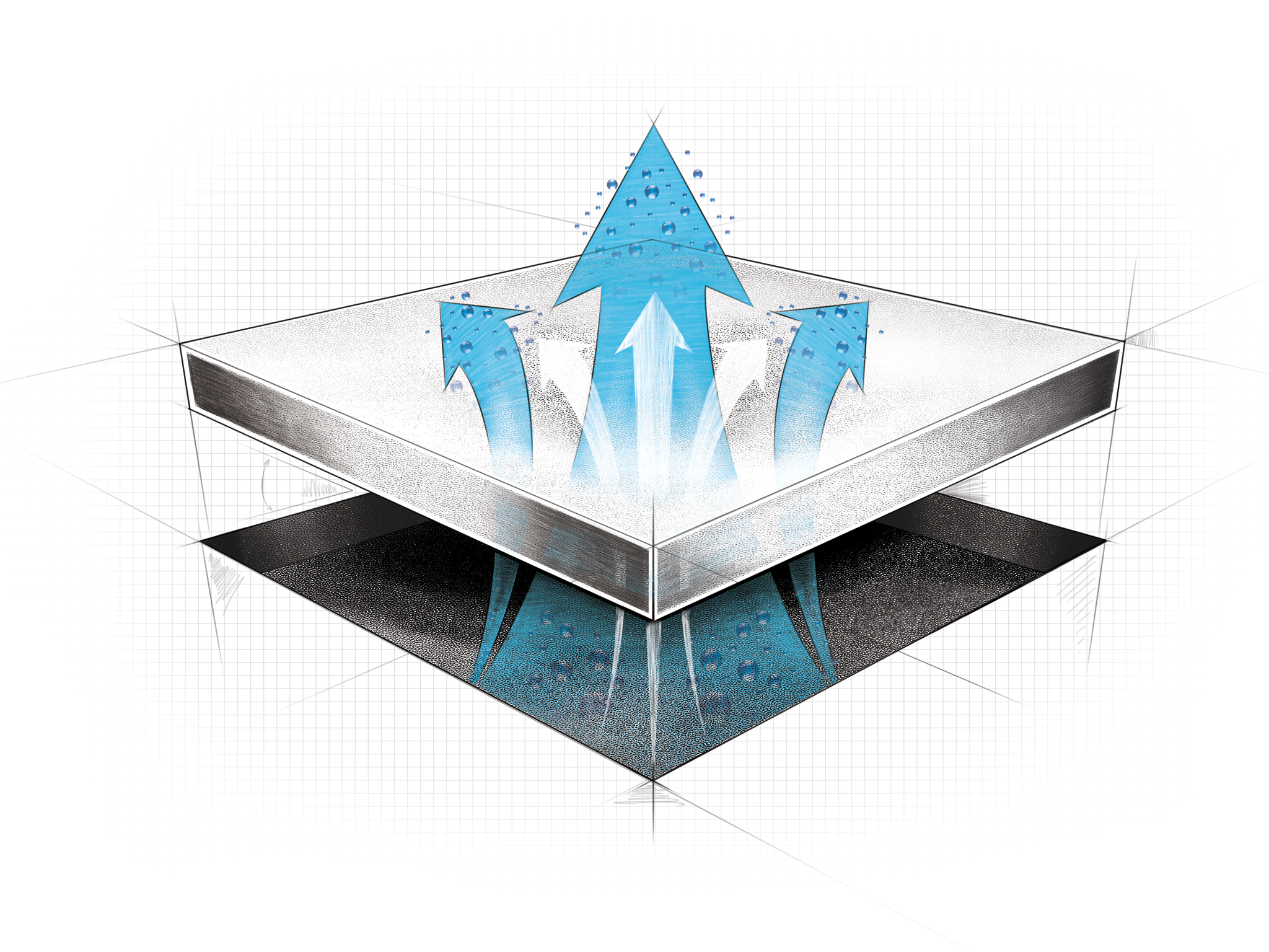Callout Illustrations to show moisture wicking, breathability, airflow, stretch and stain and water resistance.